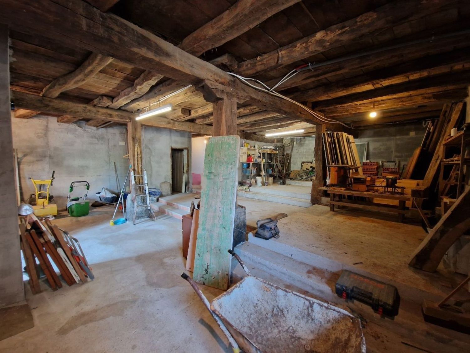 The lower floor is currently used as a workshop and storage space. It leads to the garden and could hold a restaurant or café.