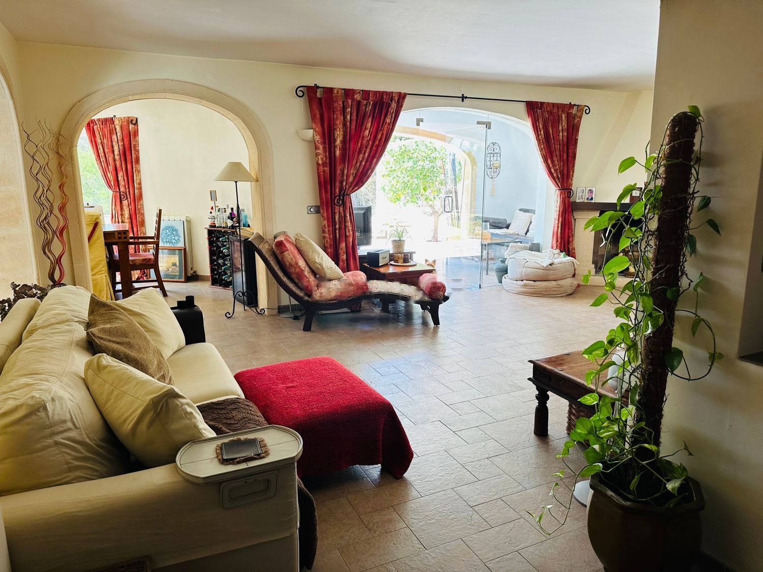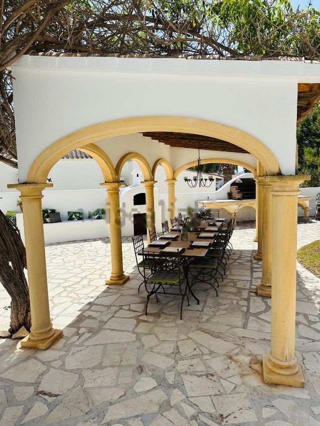 Villa única e impecable con terraza plana muy grande y jardines a los que se accede a través del salón, comedor y cocina/comedor. Dormitorio principal con chimenea y baño en suite con jacuzzi y gran ducha a ras de suelo. Acceso por puerta doble a un balcón orientado al oeste, parcialmente cubierto, con espectaculares vistas abiertas y a la montaña. Entrada con portón eléctrico con entrada privada para 2/3 coches y garaje. Sala de juegos exterior cubierta y bar. Las puertas de entrada dobles hechas a medida conducen al vestíbulo de entrada con acceso a los dormitorios 1 a 5 más un baño familiar/de visitas. El segundo dormitorio/suite de invitados también tiene sala de estar, baño privado y acceso con puerta doble a la terraza superior privada con magníficas vistas abiertas y a la montaña. La escalera giratoria conduce a la planta baja con bodega/tienda de vinos incorporada. Cocina muy grande y moderna equipada con zona de desayuno, aseo/lavadero en la planta baja con lavadora. Oficina/dormitorio 6 junto al salón. Amplio salón con chimenea, con ventana arqueada acristalada/puerta a la naya con vistas a la piscina y al jardín. Acceso con arco de tosca de planta abierta al comedor y la cocina con acceso de doble puerta al área de la piscina del jardín. El jardín lateral y trasero totalmente plano y la terraza están orientados al oeste/sur y cuentan con una casa de piscina y un cobertizo de almacenamiento. La piscina es de 8x4M. La pérgola arqueada Tosca tiene actualmente una mesa de comedor para 12 personas. También hay una barbacoa de obra de 6M con arco de tosca con área de cocina hecha a medida de 3 niveles y 2M con encimera de mármol y fregadero. Horno de pizza con almacenamiento debajo y debajo de la escalera. Asientos empotrados adyacentes con borde de plantas tropicales. Todas las habitaciones disponen de aire acondicionado frío/calor además de radiadores. Situado al final de una tranquila calle sin salida a un minuto de supermercados y restaurantes, a 5 minutos del centro y la playa de Moraira, a 7 minutos de una escuela internacional galardonada y a 5 minutos del campo de golf.