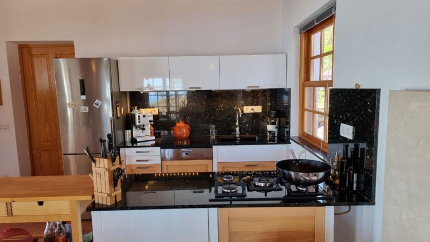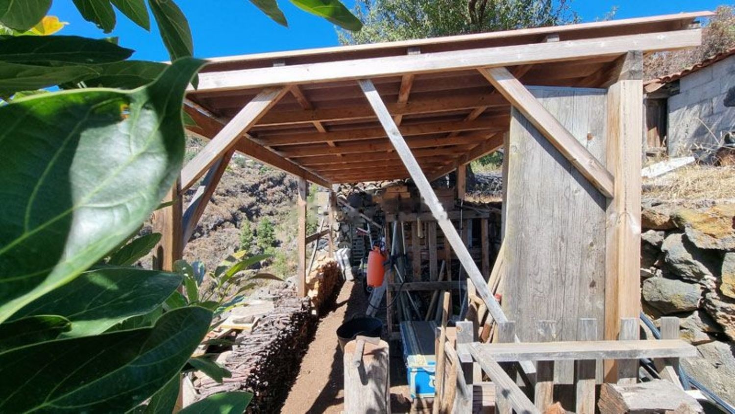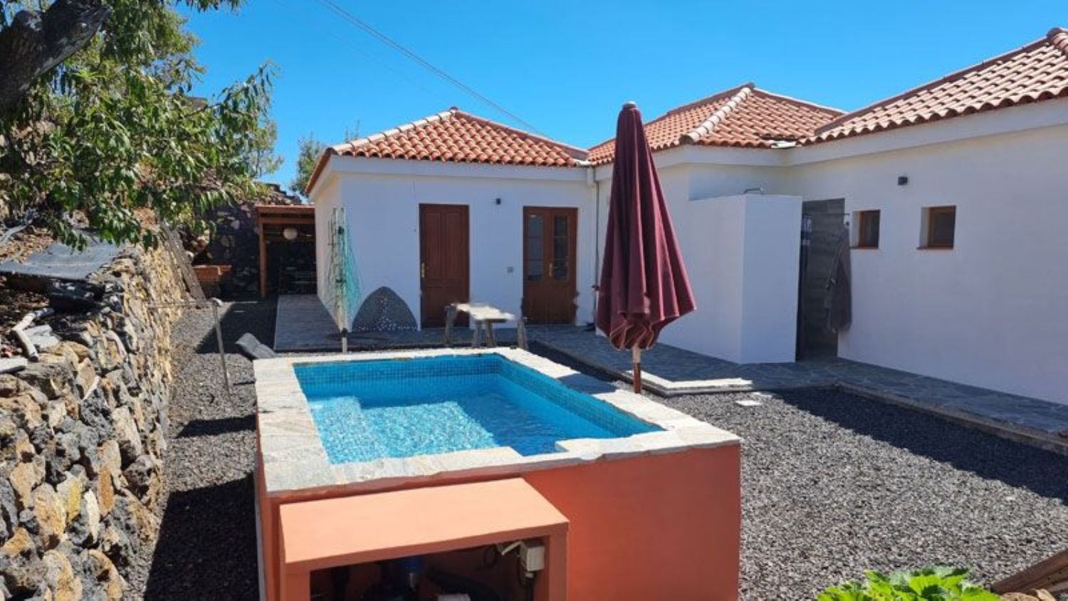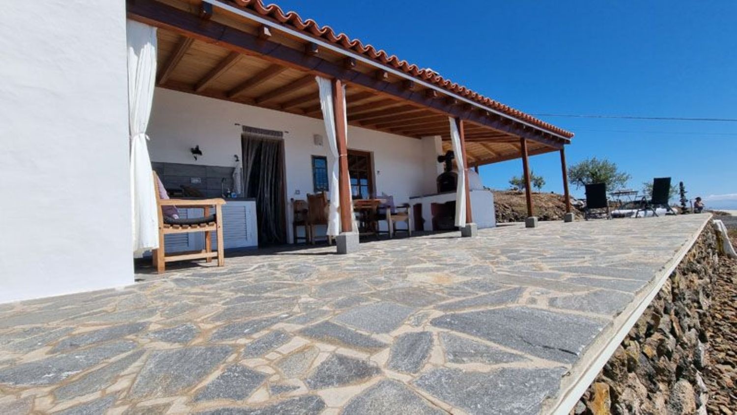 Esta impresionante casa de campo en una ubicación excelente fue construida en 2016 con ladrillo. Está completamente orientada hacia el oeste, ofreciendo una vista única al mar desde cualquier punto de la casa. La propiedad está registrada como vivienda, por lo que puede ser utilizada tanto para vivir como para alquiler (se puede solicitar como "Vivienda vacacional"). Los tres edificios que componen la casa cuentan con techos de madera al estilo canario (Riga Honduras). La casa está protegida contra la humedad ascendente, y tanto el techo como el suelo están aislados. Las ventanas y puertas de madera tienen doble acristalamiento y fueron hechas por un carpintero alemán de Puntagorda. Las robustas puertas interiores al estilo canario fueron fabricadas por un carpintero de Los Llanos. El interior de la casa está completamente embaldosado. En el exterior, cuenta con una terraza de 147m² con revestimiento de piedra natural (Laja gris), de los cuales 42m² están cubiertos por una pérgola auténtica. El núcleo de la casa es la zona de estar/comedor y cocina de 36m², donde hay una conexión para chimenea, y el horno de leña conectado actualmente garantiza cálidas noches de invierno. Tanto en la zona sur como en la norte de la casa, hay un dormitorio con baño. El ala norte puede ser utilizada adicionalmente como apartamento para invitados ya que, aparte de las puertas interiores al área de estar y cocina, tiene su propia entrada. También hay conexiones de agua y drenaje para la instalación de una mini cocina en esta habitación. Detrás de la casa, resguardada a la vista, hay una ducha exterior. Adyacente a la cocina, hay una lavandería. Aquí se encuentran las conexiones para la lavadora y espacio para estanterías para almacenar alimentos, entre otros. Al lado de la entrada principal, una puerta exterior conduce a un pequeño taller (3,75m²). En la terraza oeste, que tiene espacio para una gran mesa y sillas, se encuentra la cocina exterior con estufa de gas y fregadero, además de un impresionante horno de pizza. Detrás de la casa se encuentra una pequeña piscina de 2,5m x 1,5m, calentada por su propio panel solar. En verano, por las tardes, suele alcanzar temperaturas alrededor de 30°C. En el cobertizo, frente al espacio de estacionamiento, hay espacio suficiente para un área de asientos junto a la zona de barbacoa. La casa tiene un sistema fotovoltaico de 1,8kWp con una batería de litio-ion de 3,3kW. También está conectada a la red eléctrica por si hay días nublados durante el invierno. Actualmente, el sistema fotovoltaico alcanza una tasa de autosuficiencia del 95%. Combinado con el agua de galería privada, que puede ser alquilada, y el depósito de agua propio (instalación completa disponible), esta propiedad puede funcionar completamente de forma autónoma. Cuenta con un gran jardín con muchos árboles frutales y un sistema de riego.