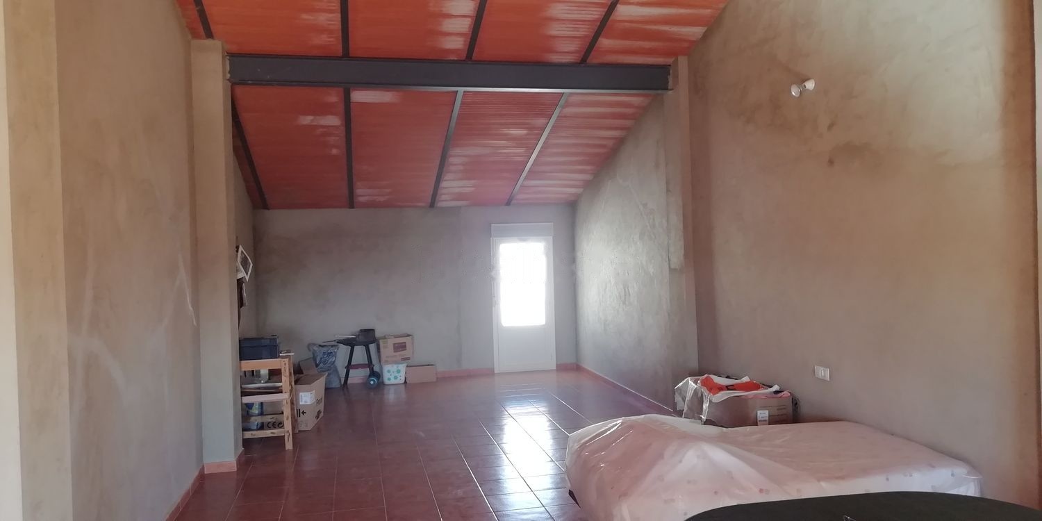Esta casa está totalmente reformada. En la planta de abajo tiene 2 habitaciones, salón, cocina y baño. Para salir al patio tiene acceso desde el salón y desde la cocina. En el patio hay manguera y una pequeña fuente con grifo. El patio también puede ser garaje ya que tiene una puerta elevadora y una puerta pequeña para salir a pie. Subiendo las escaleras en la planta de arriba hay otra terraza y un espacio