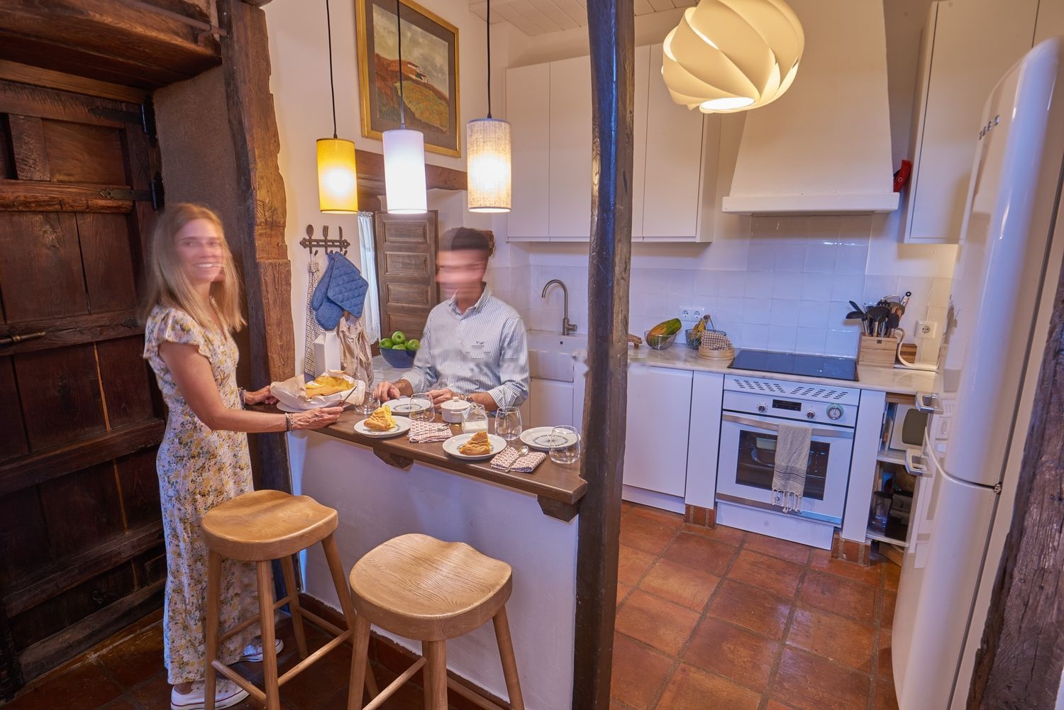 La planta principal destaca por ser un espacio completamente diáfano con diferentes ambientes integrados, gran altura de techos desde 2.92 mt, en su cota más baja llegando 3.60 mt en el salón principal. Tiene la siguiente distribución; Hall de entrada, cocina completamente equipada con todos los electrodomésticos y nevera Smeg, mobiliario de cocina en blanco mate con zona de almacenaje y zona de office. Baño de cortesía, gran salón con chimenea, patio privado como prolongación del salón y zona comedor. Los materiales utilizados son pavimentos de barro combinados con paredes de piedra natural y pintura lisa, vigas de madera y techos de madera lacados en blanco. La carpintería de puertas y ventanas es de madera natural.