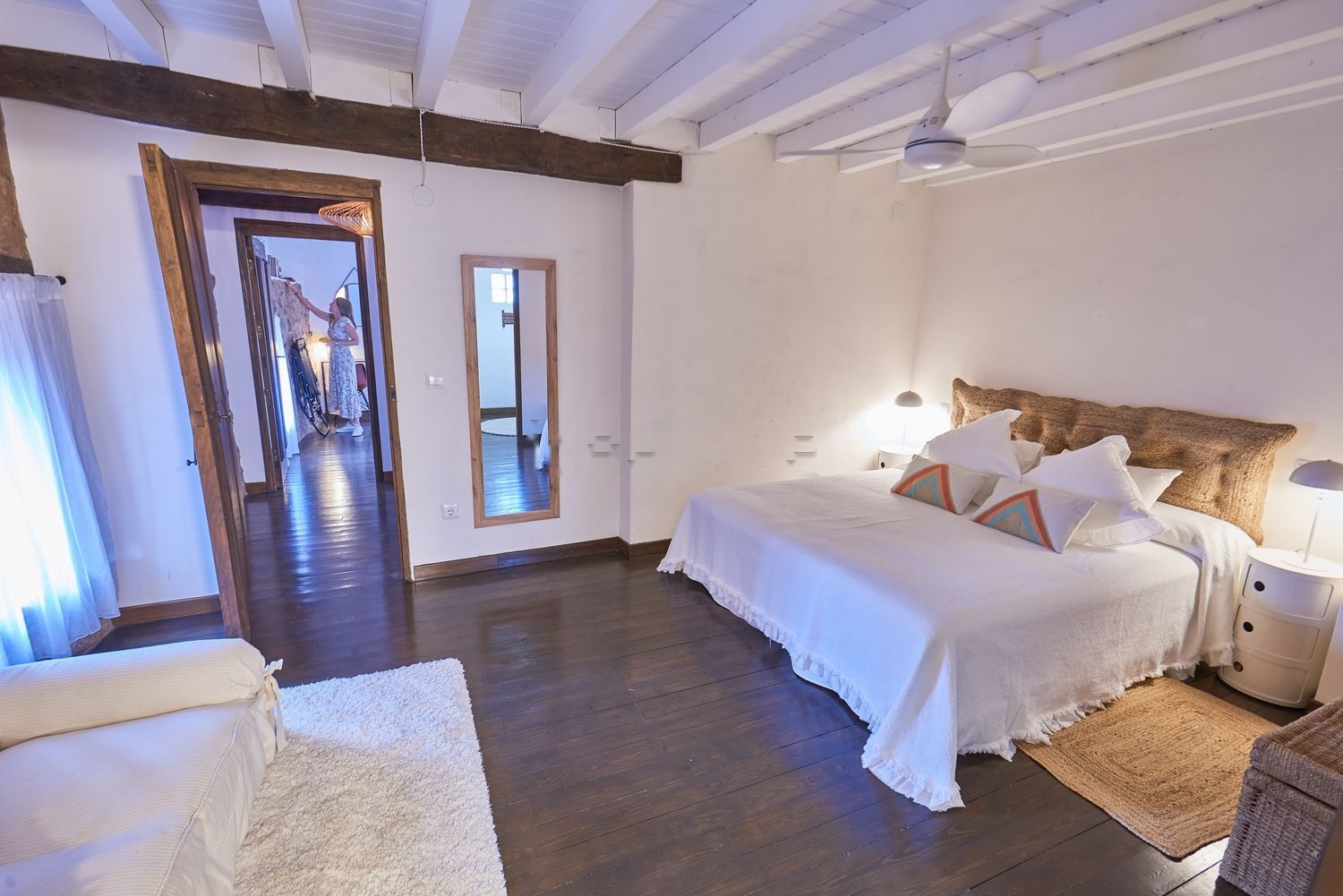 La planta primera se accede a través de una escalera de madera natural muy cómoda y amplia, encontramos un distribuidor con acceso a dos grandes dormitorios en suite con baño y vestidor. El dormitorio principal tiene una superficie de 30m2, zona de vestidor y cuarto de baño totalmente equipado con ducha y mampara de cristal, inodoro y bidé. El segundo dormitorio también en suite de 20m2, con armario, baño completamente equipado con mueble de baño, zona de ducha con mampara de cristal y un magnífico balcón típico verato. En esta planta los materiales utilizados son solados de madera natural combinados con paredes revestidas en piedra y paredes blancas lisas, techos altos revestidos en madera lacada en blanca y carpintería de puertas y ventanas en madera natural.