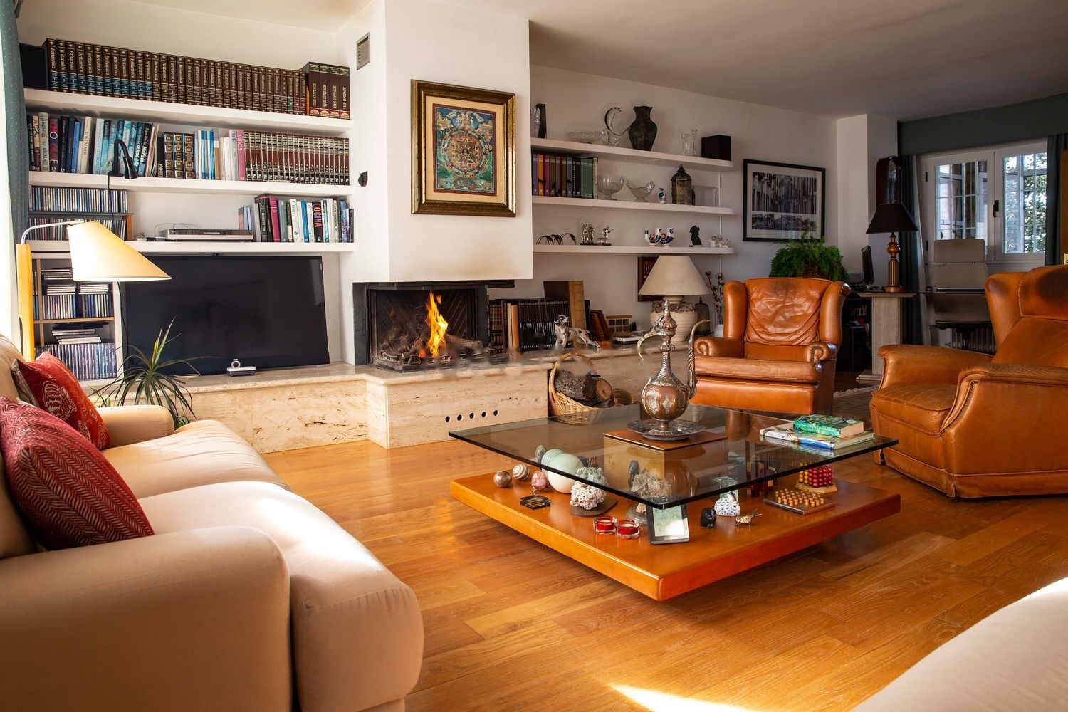 Chimenea encastrada en salón y chimenea rústica en comedor.