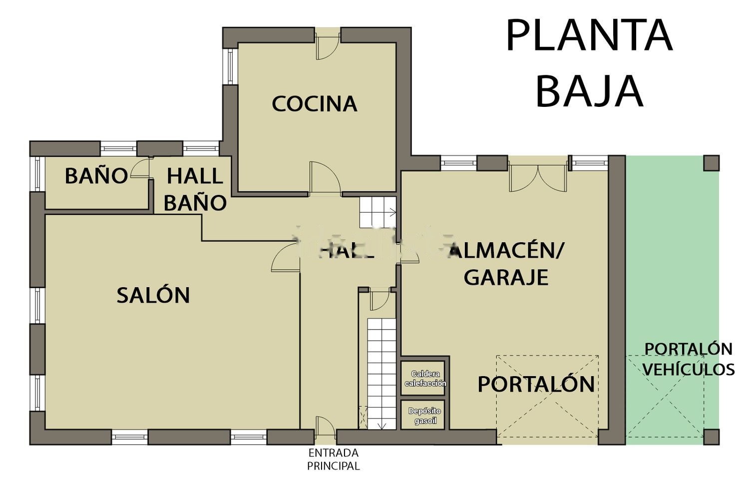Planta baja: a nivel de calle, con salón, 1 baño con bañera, y cocina bilbaina de leña y de butano. Comunicada con el garaje, donde se encuentra el cuarto de gasoil y el de la caldera de calefacción, una chimenea, y portalónes de acceso desde la calle y desde la finca.