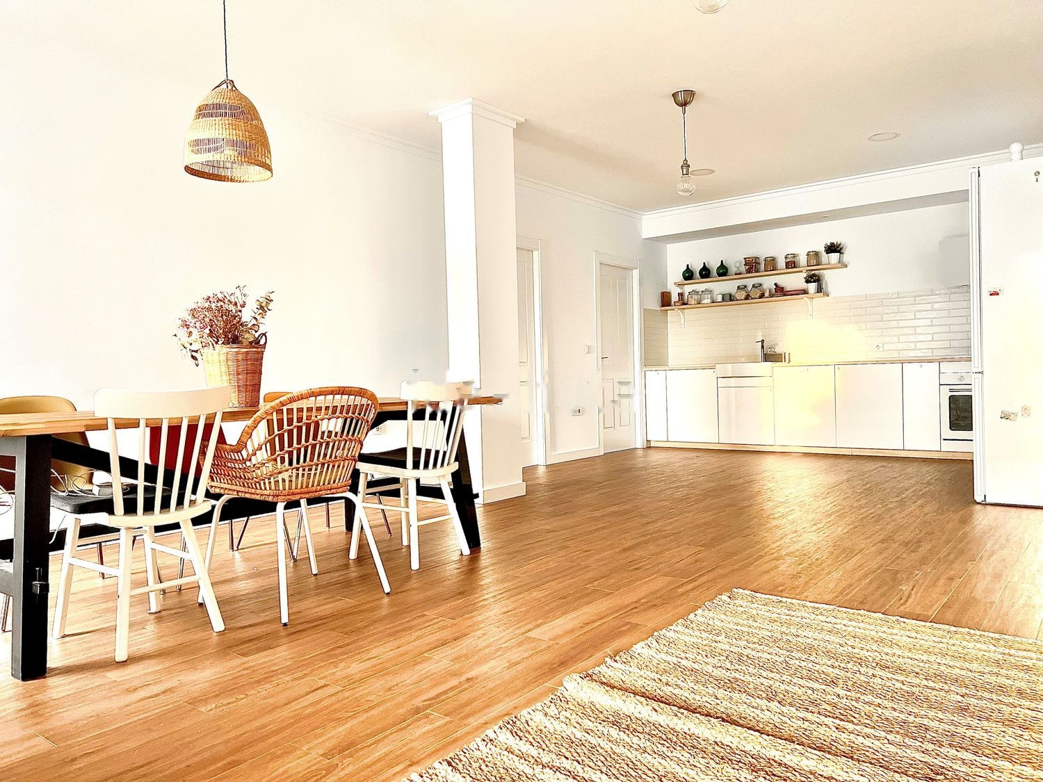 La primera planta de 129m2 construidos y 106m2 útiles independiente con puerta de seguridad es una vivienda amplia y muy soleada. Consta de gran espacio abierto de 57m2 que combina salón, comedor con gran balcón y ventana, y cocina completa en con ventana al patio de luces, lavadero de 2,5m2 equipado con fregadero y armario, un dormitorio de 14m2 con armario empotrado de 3m2, baño completo de 6m2 y puerta a terraza, un segundo dormitorio de 13m2 con vestidor de 7m3, baño de 4m2, ventana y puerta a terraza y original escalera de forja con baranda de hierro y peldaños de madera de roble con acceso a la segunda planta.