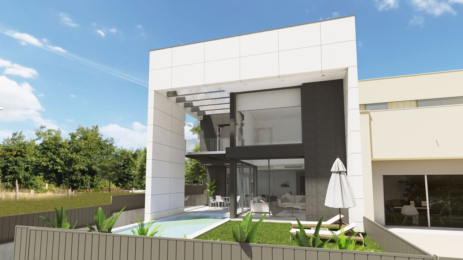 En el Garaje subterráneo encontraremos un trastero, habitación sala de máquinas, baño, sala para gimnasio y aparcamiento para varios vehículos. En la planta de acceso encontramos un amplio salón comedor, cocina, bañolavadero y una habitación doble. En la segunda planta encontramos tres habitaciones con armarios empotrados y dos baños completos. Una de ellas en Suite con baño tipo SPA y vestidor empotrado. Desde el distribuidor de la planta superior vemos el salón mediante una baranda de cristal generando una espectacular doble altura. En el jardín se encuentra una lujosa piscina SPA con acabado ROSAGRES® Mistery Grey. La piscina cuenta con un avanzado sistema de filtración autónomo NetClean de ASTRAPOOL® y un sistema de cloración salina que harán del mantenimiento de la misma una tarea muy liviana y permitirá disfrutar de la piscina. El uso de las otras áreas del Jardín se dedican a espacio multiusos. A nivel de instalaciones la casa cuenta con un avanzado sistema integral de AEROTERMIA tanto para ACS como para la climatización generada suelo radiante. El aire acondicionado se distribuye a través de conductos por cada una de las estancias Los mecanismos eléctricos son de la marca Simon® Serie 100 acabado cristal negro. Domótica: la vivienda cuenta con un sistema integral para controlar las persianas motorizadas. Seguridad: La vivienda tiene una puerta acorazada de Clase RC4 de SEGURESTIL serie TITANIUM.