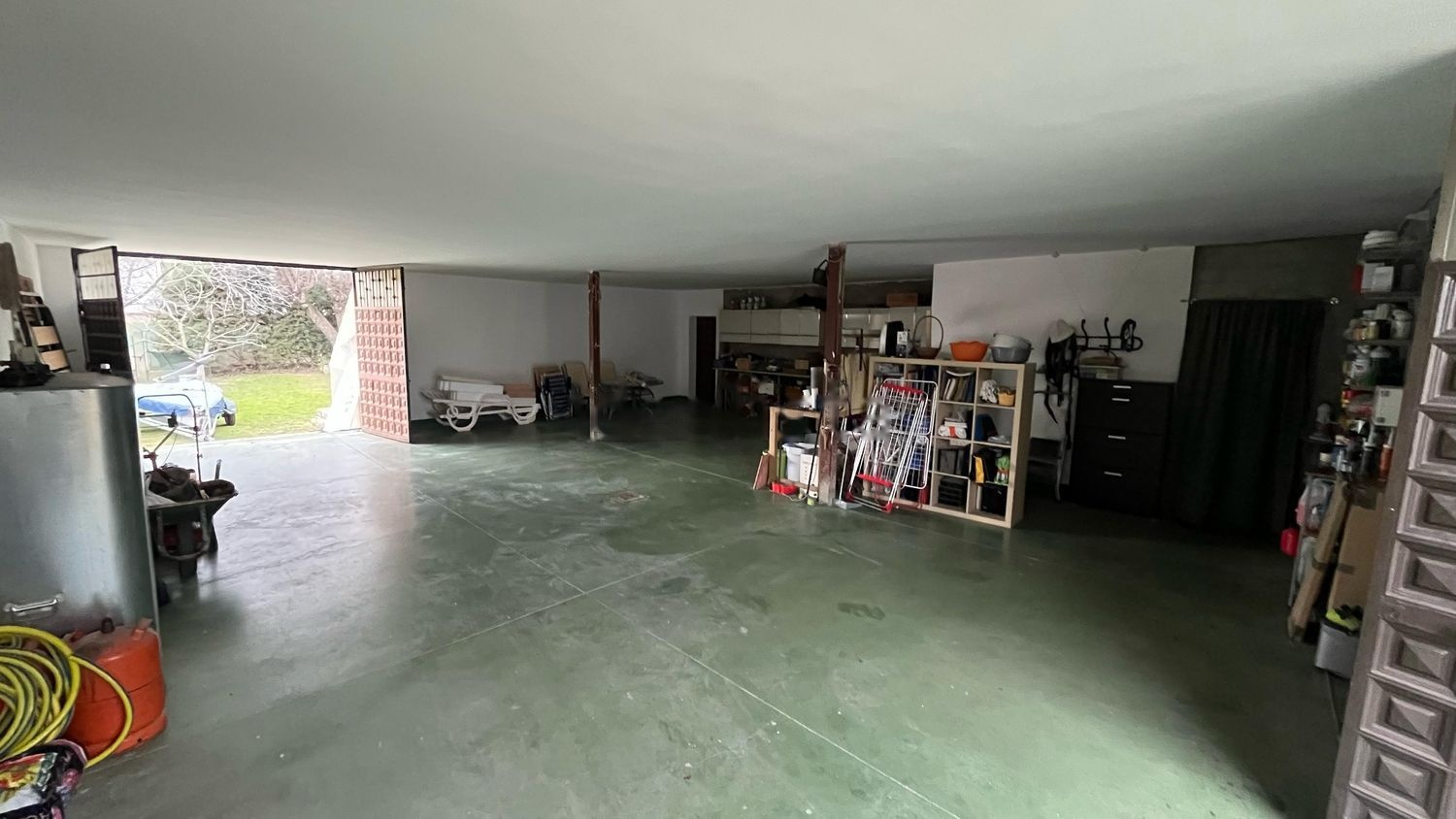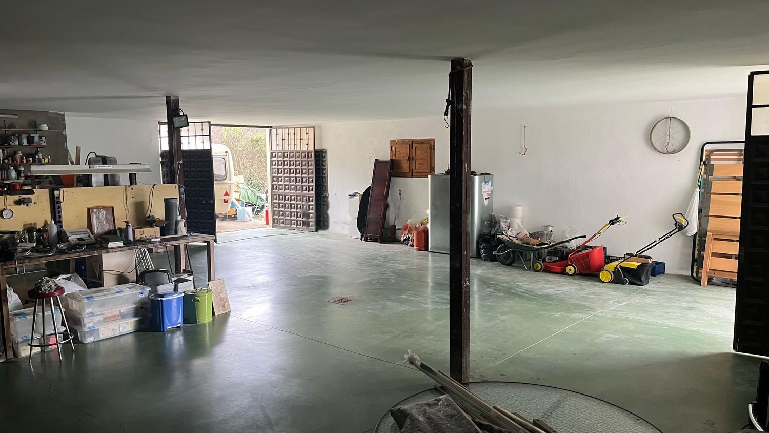 El garaje enorme con capacidad de hasta seis vehículos tiene dos puertas que comunican la parte delantera con la parte trasera de de la vivienda.