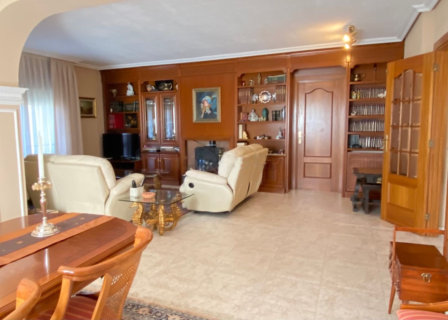 De frente entramos a un gran salón comedor con chimenea muy luminoso y con acceso directo también a la terraza que a su vez es comunicada con el jardín trasero.