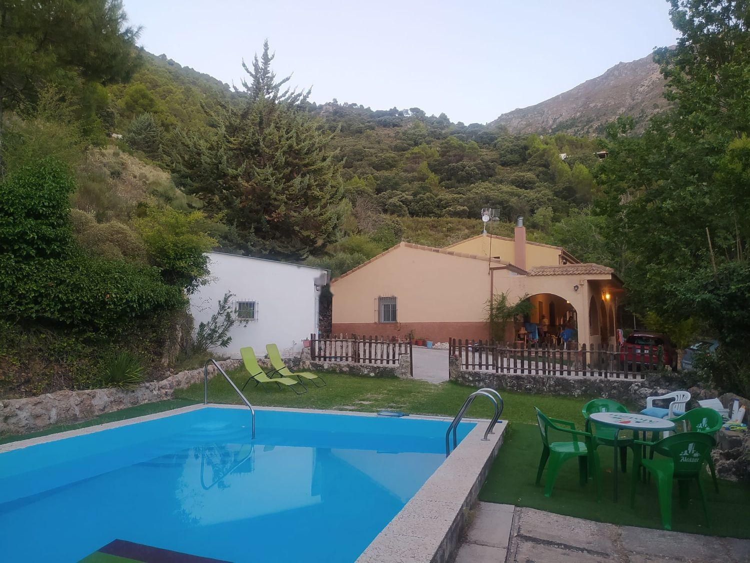 Se vende chalet en urbanización en la pandera, tiene una parcela de 5000m2, consta de tres viviendas adosadas pero independientes entre sí, la primera vivienda es de planta con tres dormitorios, baño, cocina, salón con chimenea y porche. las otras dos viviendas son de dos plantas, la planta baja consta de salón con chimenea, cocina y aseo y la segunda planta consta de dos dormitorios, baño y balcón con vistas a la montaña, ambas casas tienen calefacción mediante radiadores de calor azul. La parcela tiene piscina con zona de jardín.
