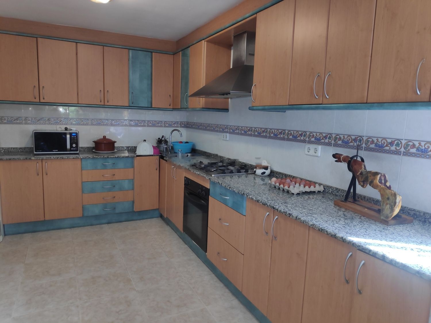 Casa de 4 habitaciones dobles y dos habitaciones sencillas, con dos cuartos de baño completos. Gran cocina totalmente funcional con bancos y mesa de madera.