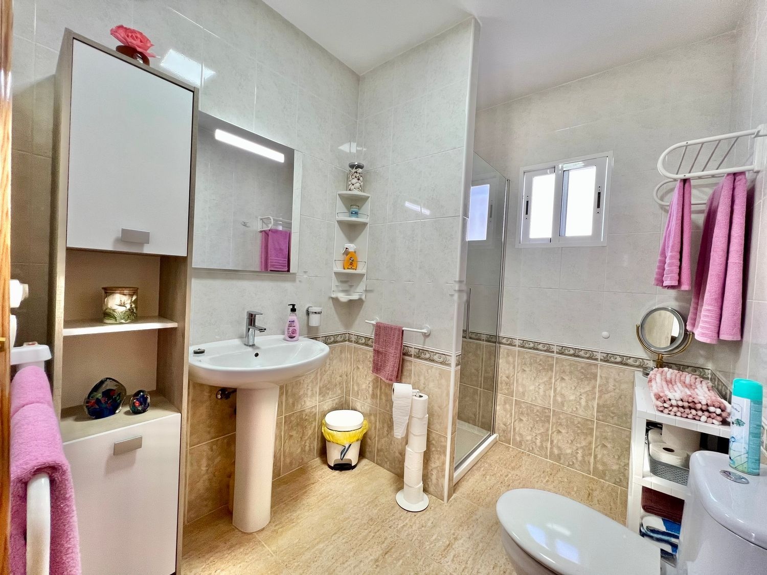 Hay 2 dormitorios dobles, cada uno con aire acondicionado y grandes armarios empotrados, además de 2 baños modernos, uno de ellos en suite.