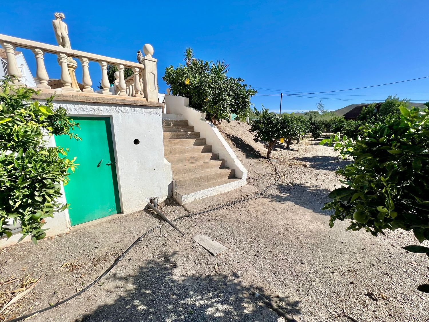 Unos pocos escalones más abajo hay un hermoso y largo huerto con más de 20 naranjos, limoneros y pomelos, luego, bajando por una rampa de concreto, se encuentra otro gran terreno adecuado para muchos usos, como ocio, cultivos, animales o pájaros, tal vez incluso un prado. todo dentro de la misma parcela vallada que la Villa.
