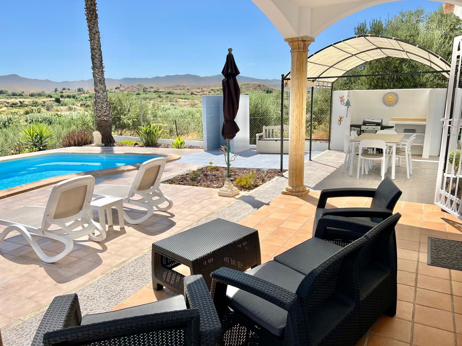 Hay vecinos cercanos, incluidos españoles y británicos, pero la villa y la parcela son privadas y en gran medida no se pasan por alto.