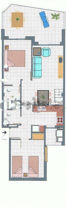 planta baja: dormitorio principal + dormitorio 1 cama + baño+cocina+ salón+ terraza (15 m2) + tenderero interior.