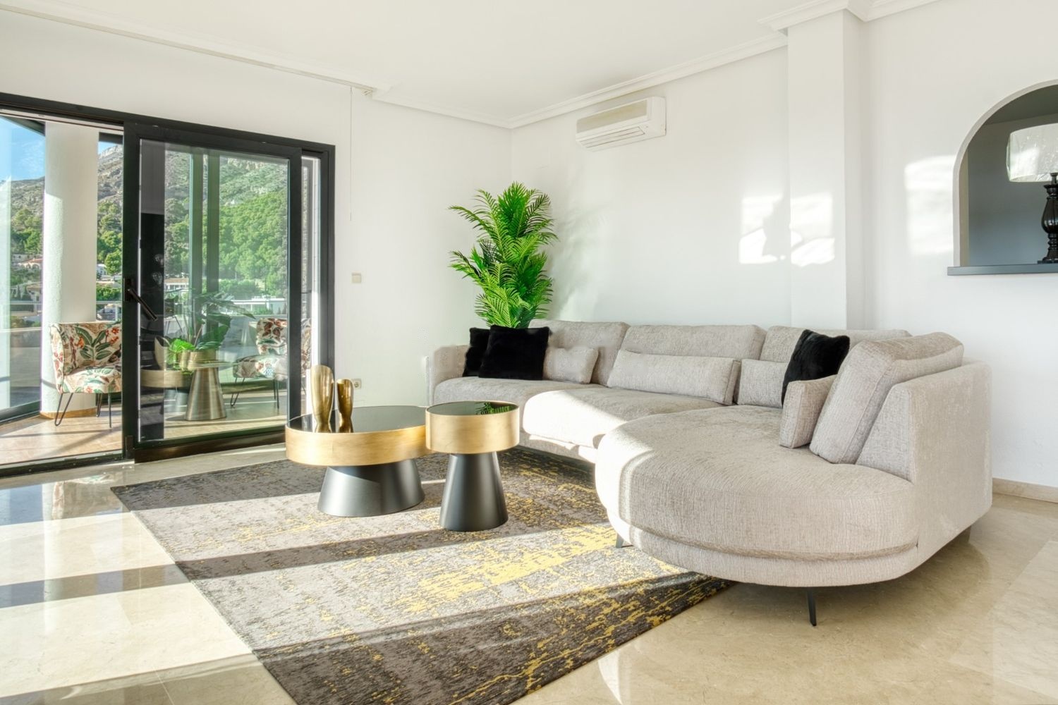 El interior es luminoso, moderno y opulento. Ha sido amueblado con los más altos estándares y algunas piezas son únicas. La impresión inmediata al entrar es impresionante; Muebles y obras de arte únicos y de alta gama con posiblemente las mejores vistas de la zona como telón de fondo. Hay una sensación real de espacio al ingresar al salón desde el pasillo y justo al lado del salón hay una terraza acristalada con vista a la gran terraza y a las montañas.