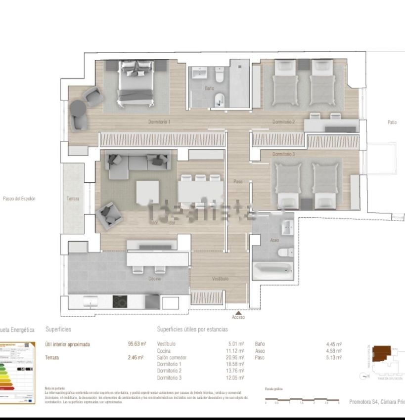 suelos: gres cerámico de 1200x1200mm, vidrios dobles (bajo emisivos), exterior, nivel energético de emisiones: B, 11, nivel energético de consumo: B, 54.