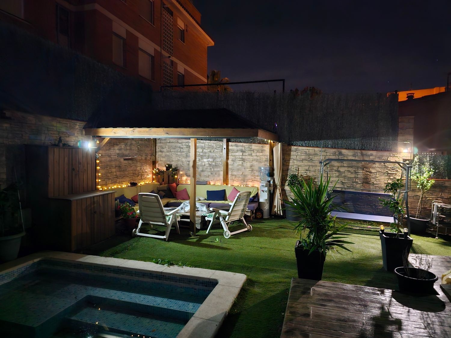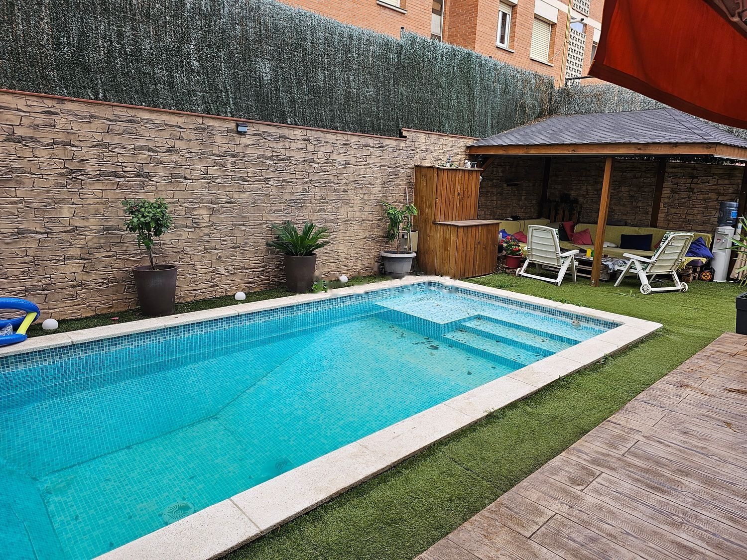 Planta Baja, 162m2 jardín con acceso directo a la vivienda desde la calle, 2 terrazas 30m2 con pérgola madera pino y porche 25 m2, 4 habitaciones (1 suite) 2 baños, piscina privada 6x3, Chill Out 12m2 con pérgola de madera de pino, parking y trastero. Salida directa a la calle. Perfecto para vivir como en una casa en el centro de la ciudad. Perfecto para disfrutar el máximo confort.