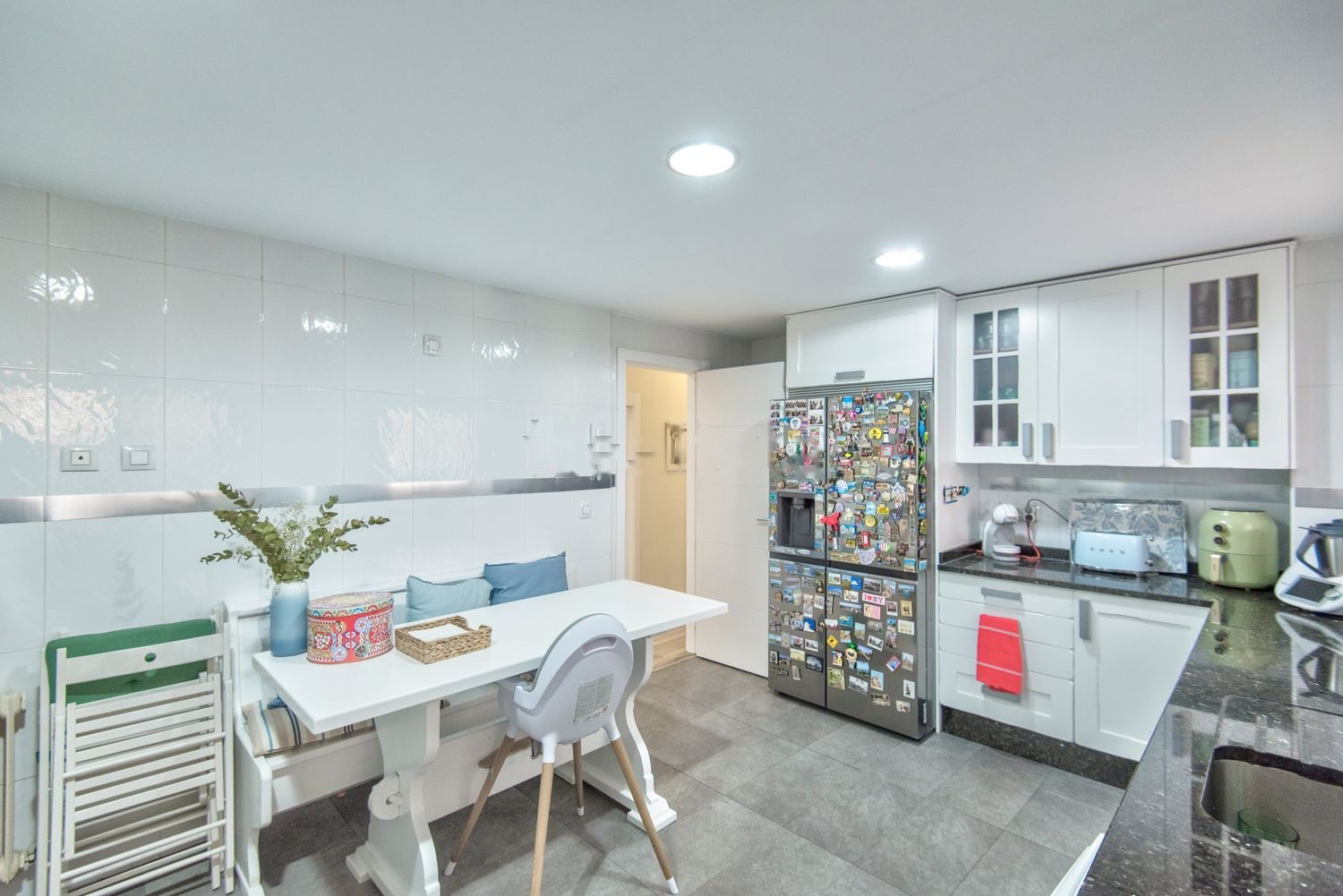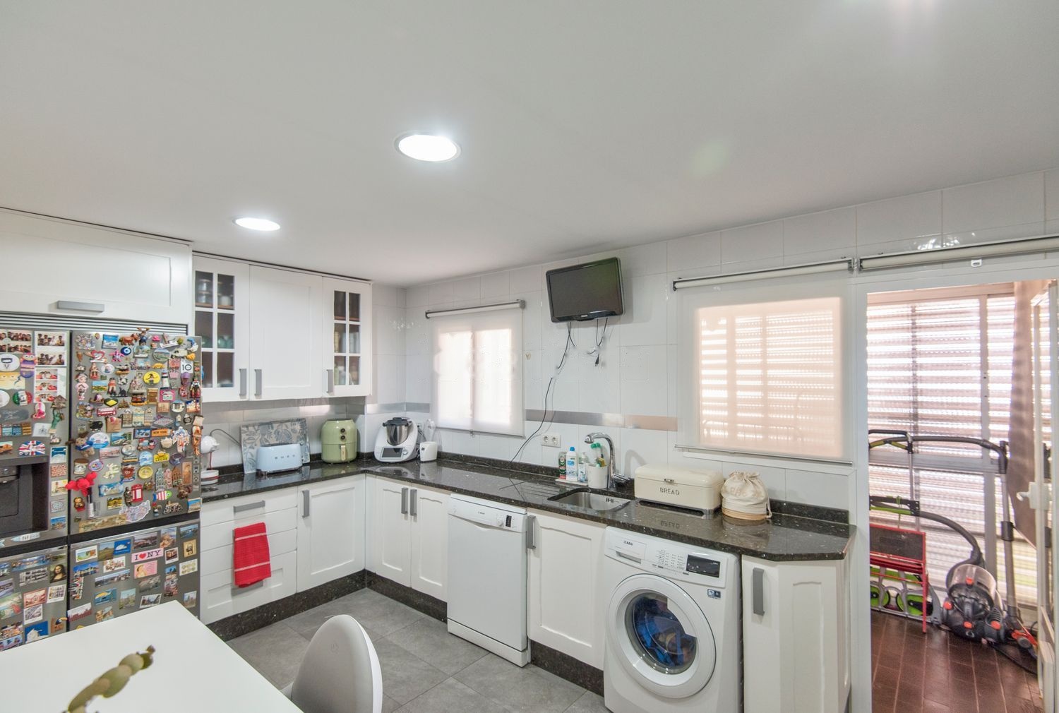 El piso está distribuido en un recibidor que da paso a un amplio Salón-Comedor muy luminoso, con salida a la terraza con vistas al jardín y piscina; Cocina independiente, espaciosa completamente amueblada (muebles altos de madera maciza lacados en blanco) con encimera de mármol, donde podrás comer si así lo deseas, desde la cocina se accede a una terraza cerrada, para usar como alacena o tendedero.