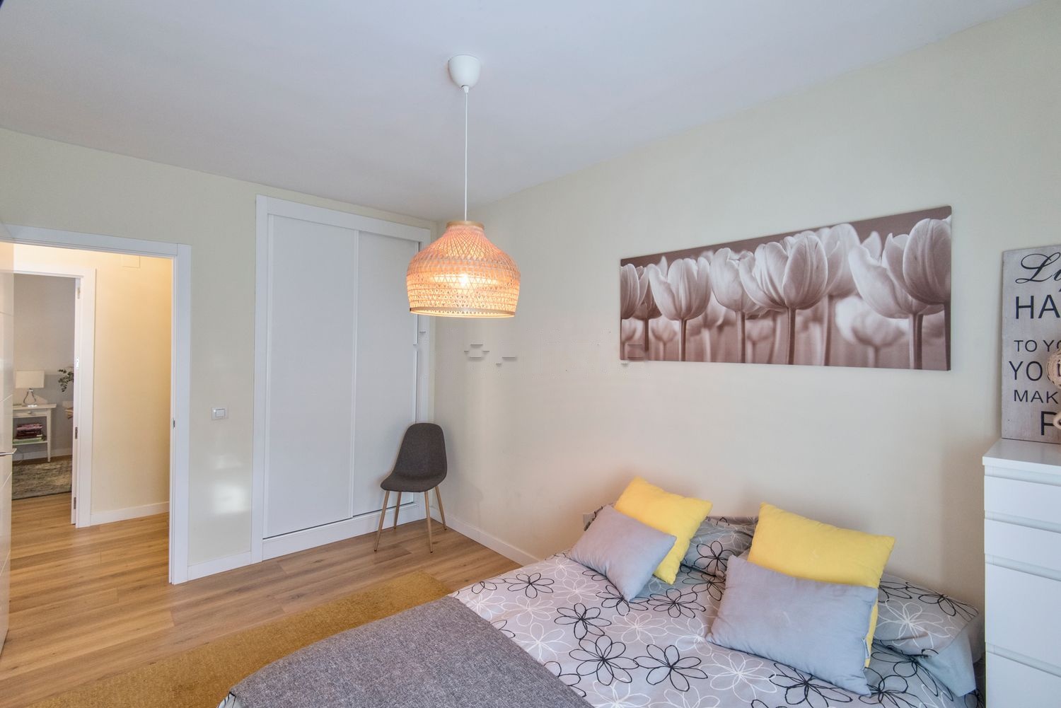 En la vivienda hay tres habitaciones individuales, una habitación de matrimonio con baño en suite (con plato de ducha grande) y armario empotrado totalmente vestido; dos habitaciones individuales con sus respectivos armarios empotrados; en el pasillo se encuentra otro baño totalmente equipado con mueble y mampara de baño. También es reseñable el armario ropero que se encuentra en el pasillo.