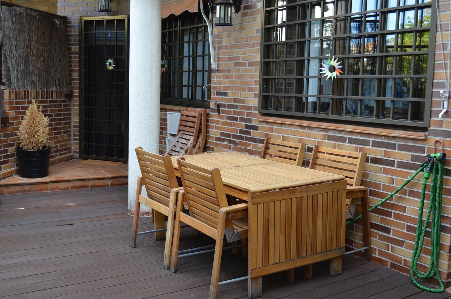 Acceso a su amplia terraza de dos ambientes a través del salón y la cocina, zona de sofás y mesa para comer bajo su pérgola. Bajando unas escaleras se encuentra un precioso jardín con árboles frutales y caseta para guardar en invierno parte del mobiliario de verano y las herramientas con las que cuidar el jardín