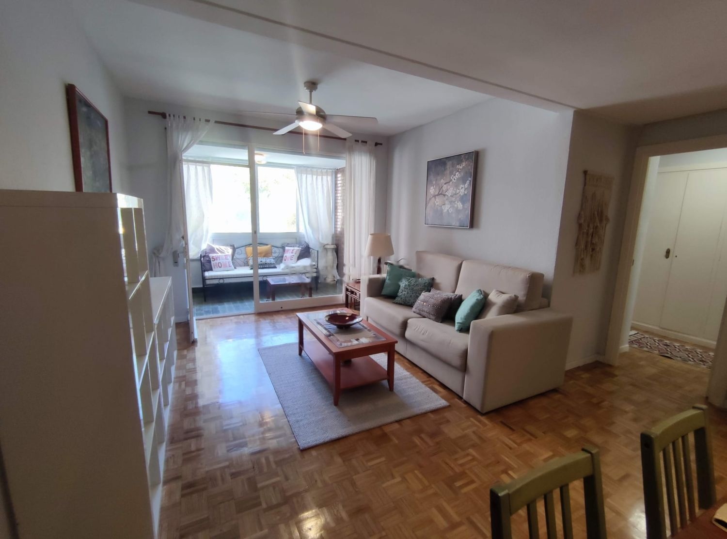 El recibidor nos da paso a través de una puerta al salón amplio luminoso perfecto para pasar buenos ratos de relax gracias a su gran ventanal y balcón acristalado con mucha luz y vistas a una a un jardín arbolado y una calle tranquila.