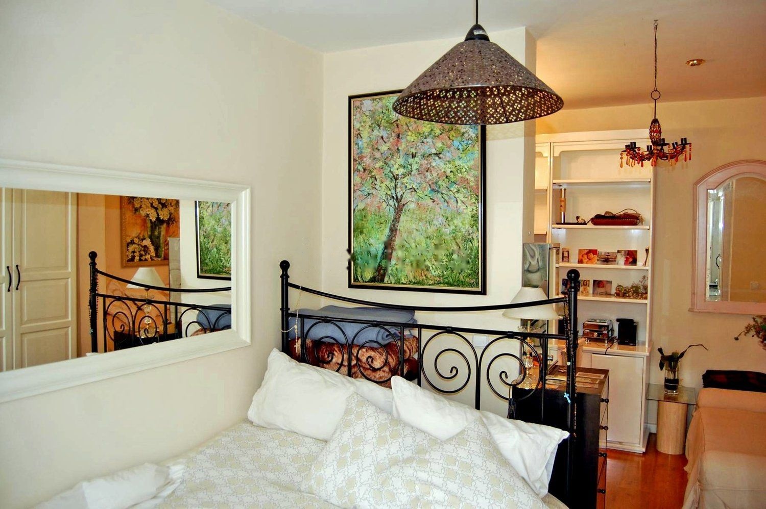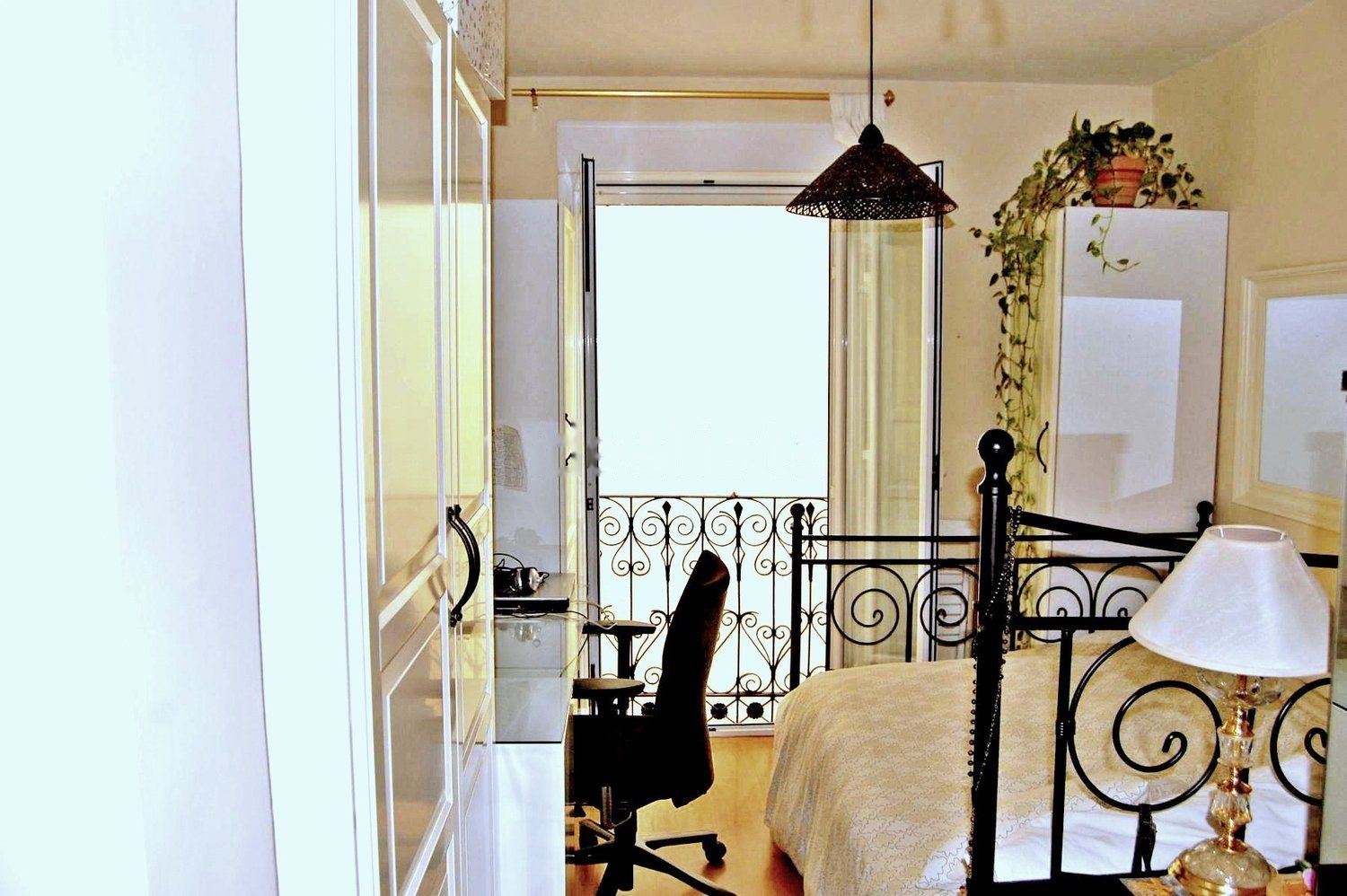 Dormitorio: Independiente. 11 metros cuadrados. Cama matrimonio en forja negra de 1, 50 x 2 metros. con gran espacio bajo cama para almacenaje. Amplio escritorio con grandes cajoneras de madera lacadas en blanco. Sillón escritorio. 4 amplios armarios con altillos, 2 mesillas-sifonier de madera. Gran balconera de 2, 20 x 1, 10 metros con forja negra. Pequeño rincón maletero.