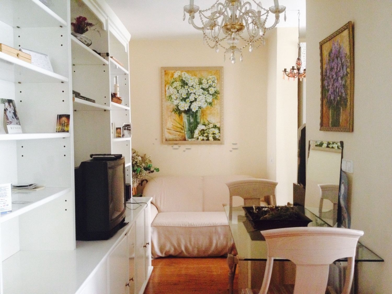 Salón: 12 metros cuadrados. Sofá 2 plazas. Mueble librería de 3 metros, lacado en blanco, con armarios de gran capacidad.