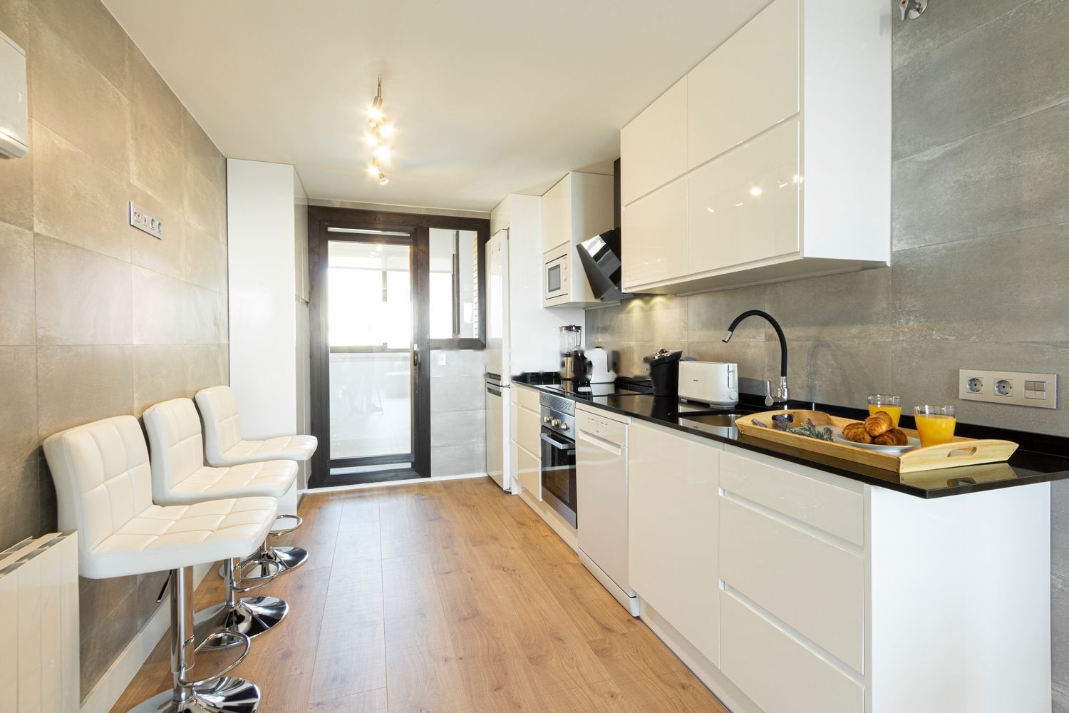 Suelos de madera, armarios, radiadores, AA y ventiladores en todas las estancias. Muy bien aislado térmica y acústicamente. La cocina dispone de todos los utensilios necesarios para largas estancias. Cuenta también con una amplia barra con 2 sillas altas.