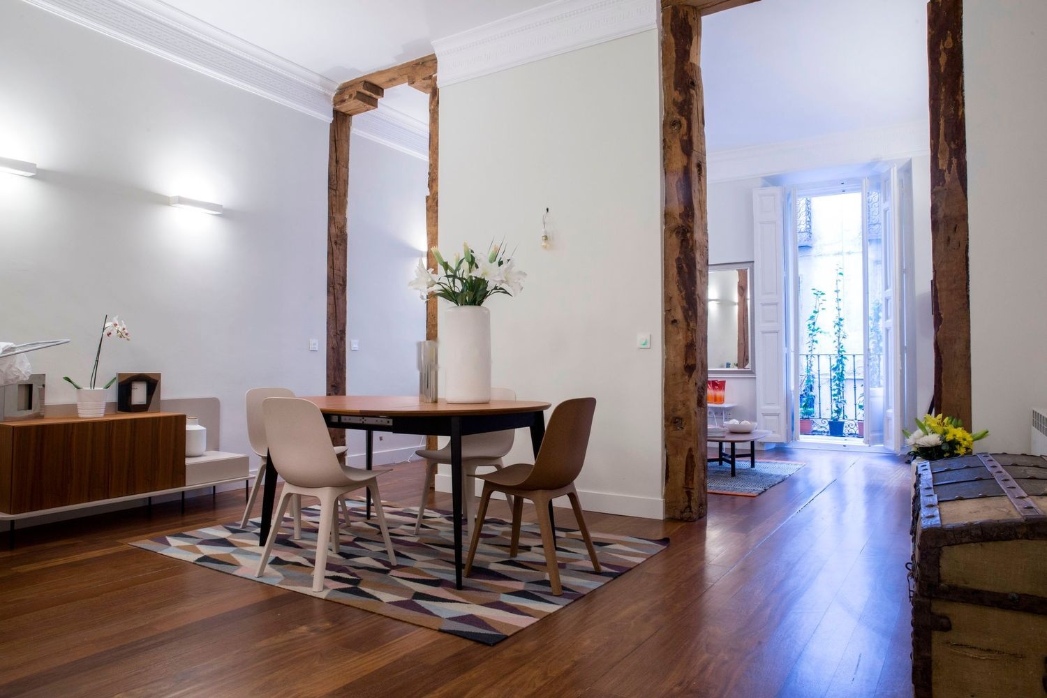 Este apartamento está recién reformado y es muy espacioso (87 m² útiles). Además se encuentra en un sitio espléndido, a pocos metros de los Metros Gran Vía y Callao en un bonito edificio del famoso barrio de Malasaña. Ofrece dos amplios y luminosos espacios exteriores a dos calles diferentes separados por una cocina, un baño y una puerta corredera de vidrio translúcido que permite la entrada de luz a la zona de cocina.