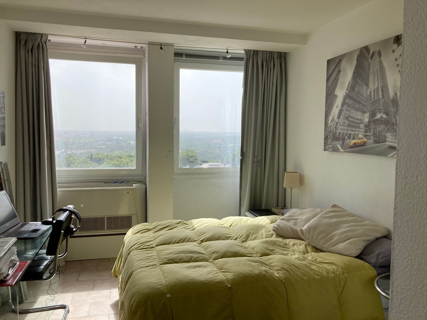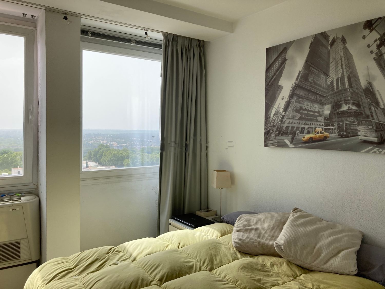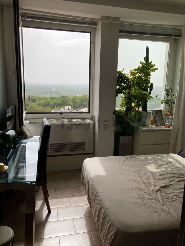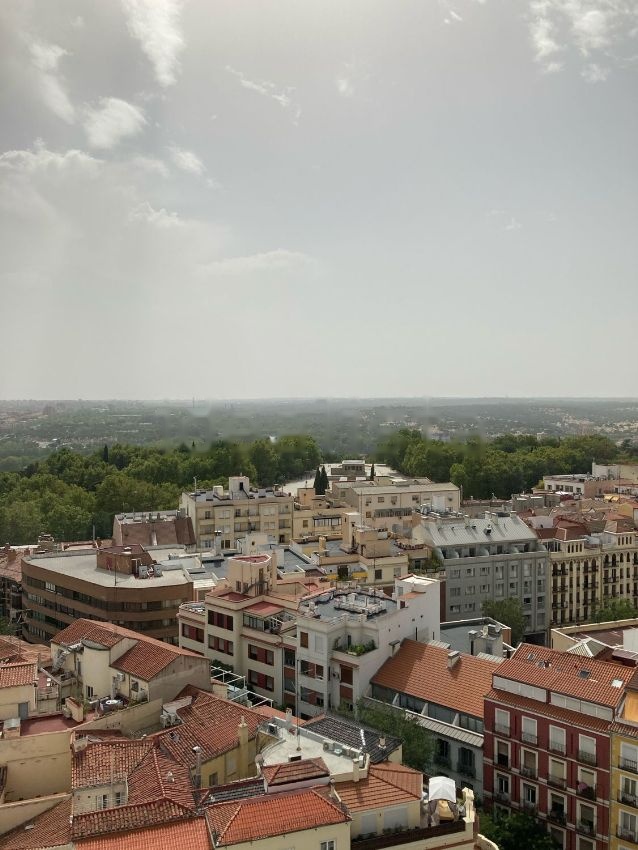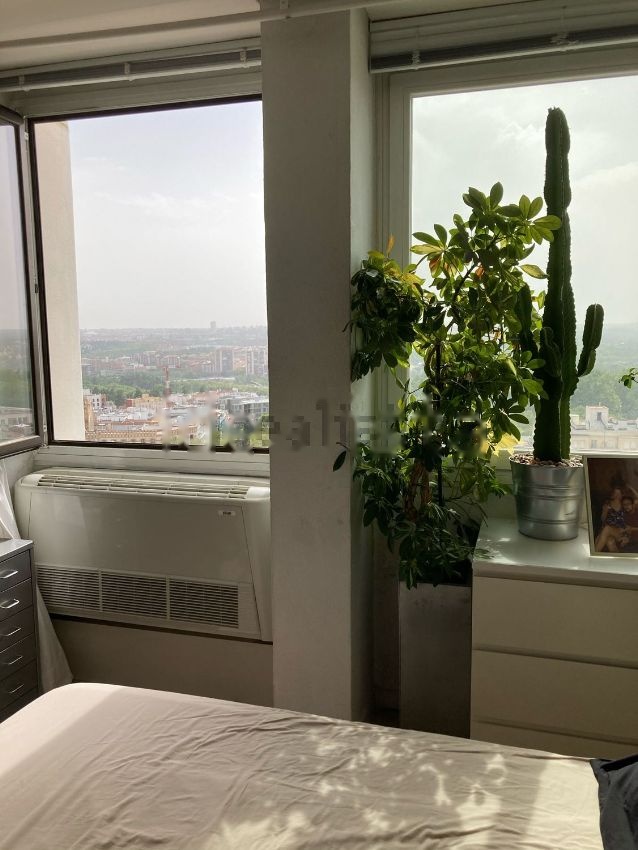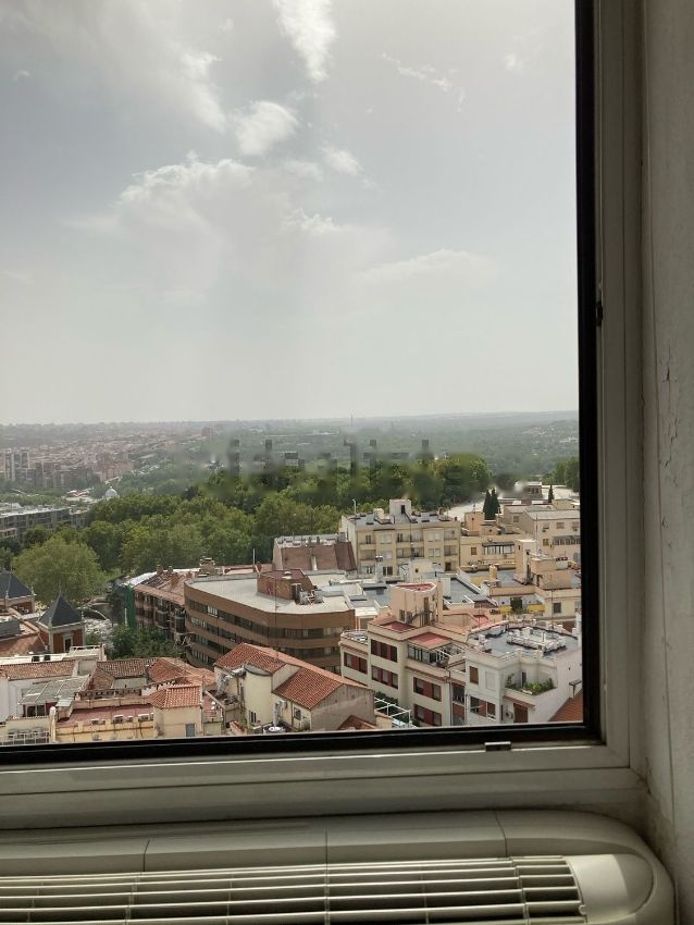 Vista panorámica y frontal a Templo de Debod, casa de campo, El Lago, Parque de atracciones y bonita puesta de sol frontal sin obstáculos; a la izquierda vista del Palacio Real y a la derecha teleférico y sierra de Madrid. Es el último piso. Está en la planta 14 sin vecino encima, no tiene ruidos. Originalmente es un apartamento de 1 habitación pero se ha dividido el salon para una segunda habitación, por lo que el salon queda reducido a la mitad y sin ventanas. El estado de la vivienda es a reformar, por lo que hay un plano de planta en diáfano para nueva distribución.