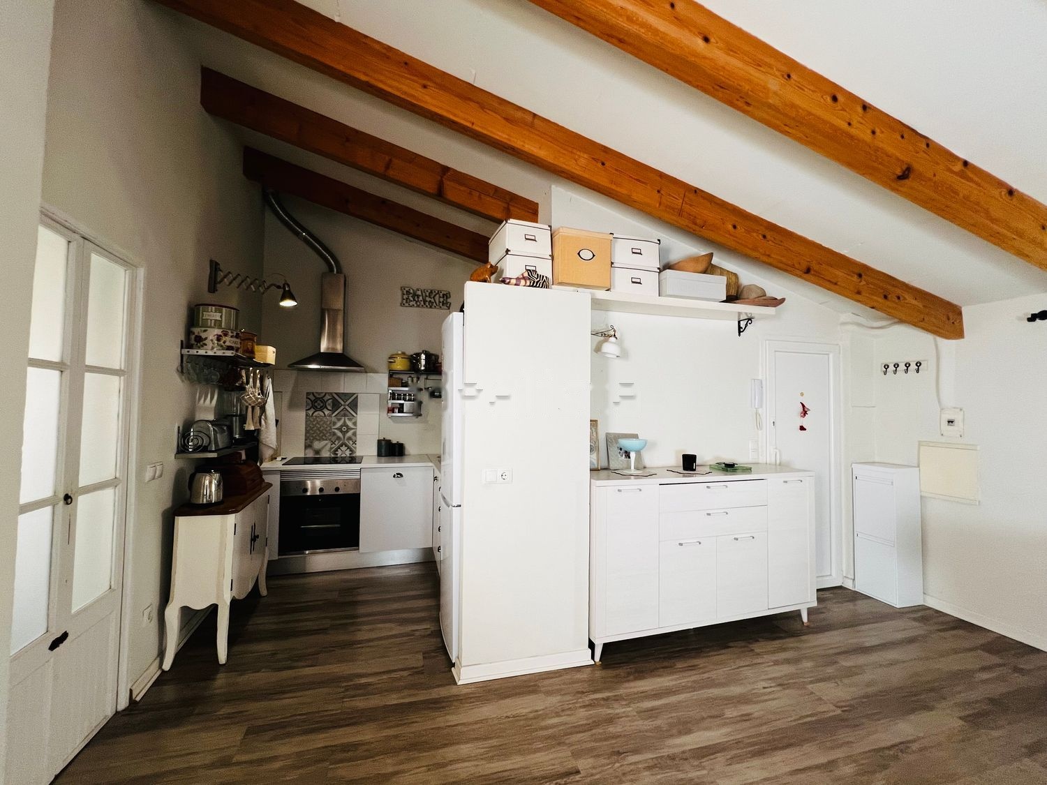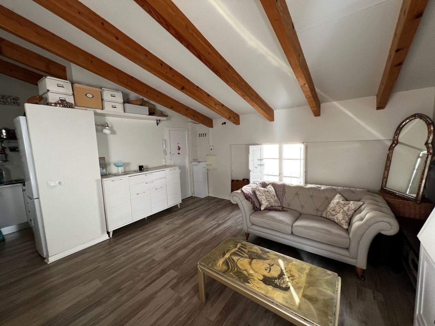 Encanto y Estilo: Este acogedor apartamento cuenta con un techo abuhardillado y vigas vistas que realzan su encanto único.
