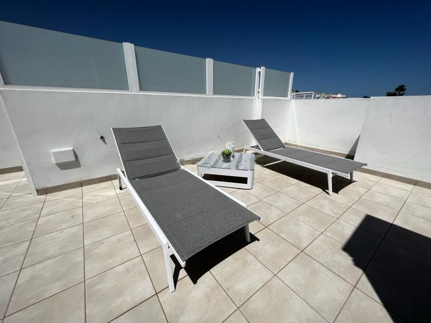 3. Azotea con (gran tumbona, tumbonas personales, fregadero, mesa de comedor para 8 personas, ducha).