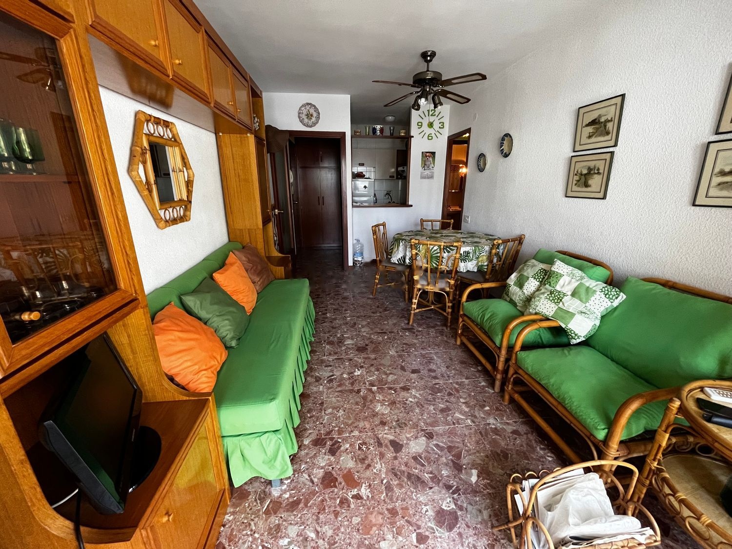 Se vende apartamento en zona turística de Salou. Está situado en una comunidad con piscina y zona verde y sólo está a 400 metros de la playa. El apartamento tiene 45 m2 y está formado por una cocina americana que da al salón, un baño y habitación grandes y una amplia terraza con vistas a la piscina. El apartamento está equipado con muebles y electrodomésticos. Muy cerca de Port Aventura, restaurantes y zonas de ocio.